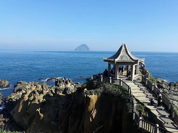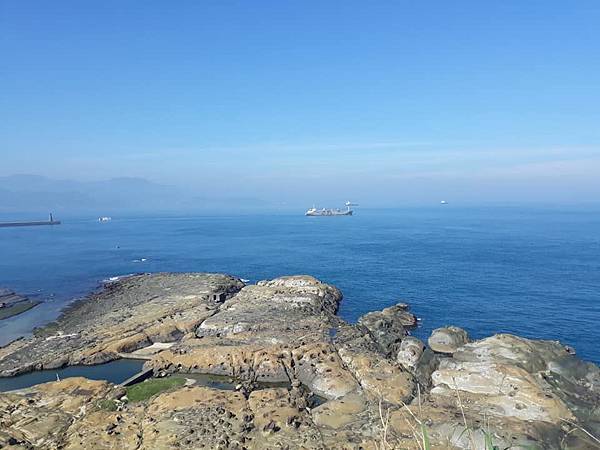 🔽海兔石眺望鯨魚島(基隆嶼),海兔石旁邊的石頭則像是河馬。根據海邊礁石外形來命名,讓遊客覺得有親切感。海兔石看起來也像是頭部上仰45度角的犀牛,如果在滿月夜來和平島公園,可用犀牛望月來形容。